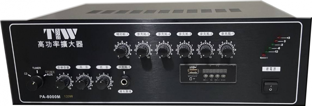 功能: 5組麥克風輸入混音 (音量獨立控制) 高低音獨立控制音質 5段LED音量指示 1組麥克風 優先廣播 1組Aux音量控制 3組音樂輸入選擇